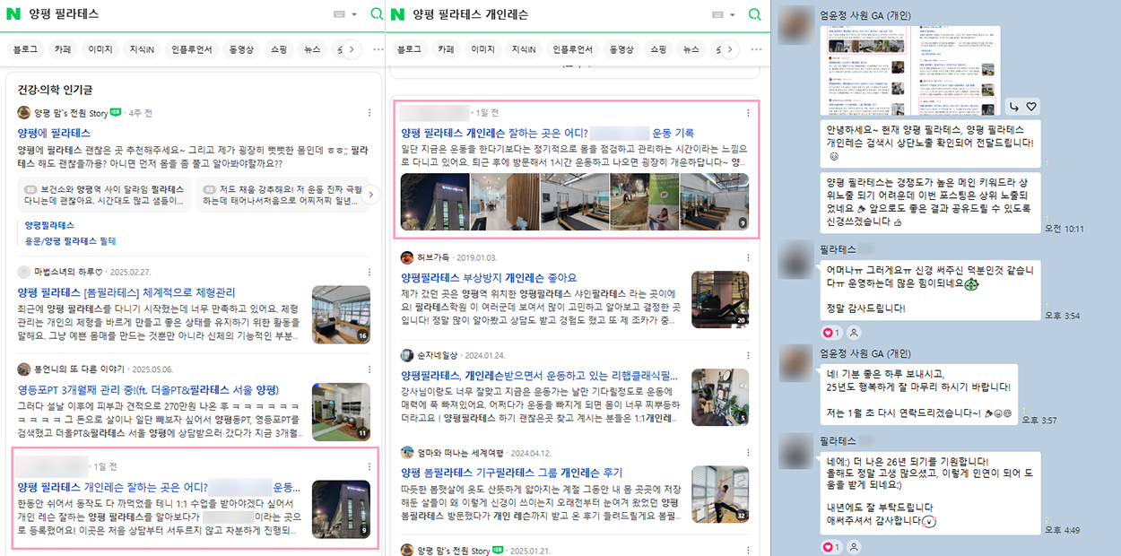 높은 경쟁률의 지역 필라테스 메인 키워드도서브 키워드와 함께 노출 효율을 더더욱 끌어올린 케이스!