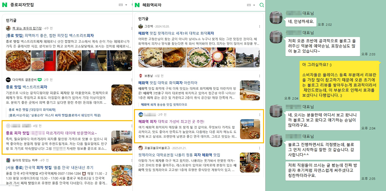 실제 방문자 후기처럼 공격적인 블로그 리뷰 마케팅 진행 후예약, 포장 손님이 폭증한 종로 대학로 근처 피자 맛집!