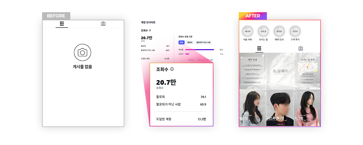 별도 관리가 없었던 헤어샵 인스타그램 계정을오프라인 매장과 유사한 톤앤매너의 시술 사례 피드로 재구성!