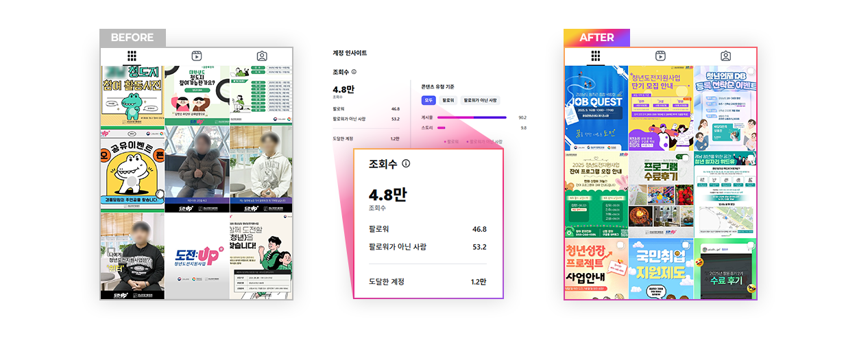 지역 청년들을 위한 정부 지원 사업을 소개하는 카드뉴스로 청년을 타겟으로 한 조회수 및 도달 계정 급증!